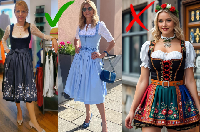 Traditionell reicht der Rock bis übers Knie, oft wadenlang oder bodenlang für festliche Anlässe. Mini-Dirndl sind fast immer ein Touristenmerkmal – wie das KI generierte Bild im direkten Vergleich.