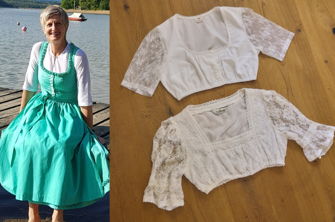 Eine Dirndl-Bluse macht den Look komplett. Sie ist immer kurz und körpernah geschnitten und endet knapp unter der Brust. So trägt sie unter dem Mieder nicht zusätzlich auf.