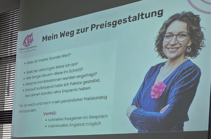 Die erfahrene Kollegin gab einen außergewöhnlich offenen Einblick in ihre Arbeitsweise und stellte ihr flexibles Konzept der Paketangebote vor. Dabei ging es nicht nur um Modelle und Strukturen, sondern auch um ganz konkrete Zahlen, Kalkulationen – inklusive der Vor- und Nachteile, die sich daraus ergeben.