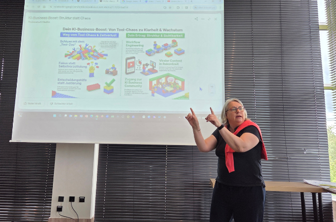 In ihrem zweistündigen Workshop zeigte sie eindrucksvoll, wie Künstliche Intelligenz gezielt im Alltag von Solo-Selbstständigen eingesetzt werden kann – nicht als Spielerei, sondern als echtes strategisches Werkzeug.