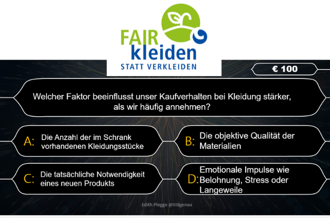 In einem interaktiven Quiz – angelehnt an „Wer wird Millionär“ und begleitet von der passenden Musik – wurde das Thema „Fair kleiden statt verkleiden“ aus der Nachhaltigkeits-Taskforce aufgegriffen. Vielen Dank an Edith Plegge, die die Präsentation vorbereitet hat, obwohl sie nicht an dem Treffen teilnehmen konnte.